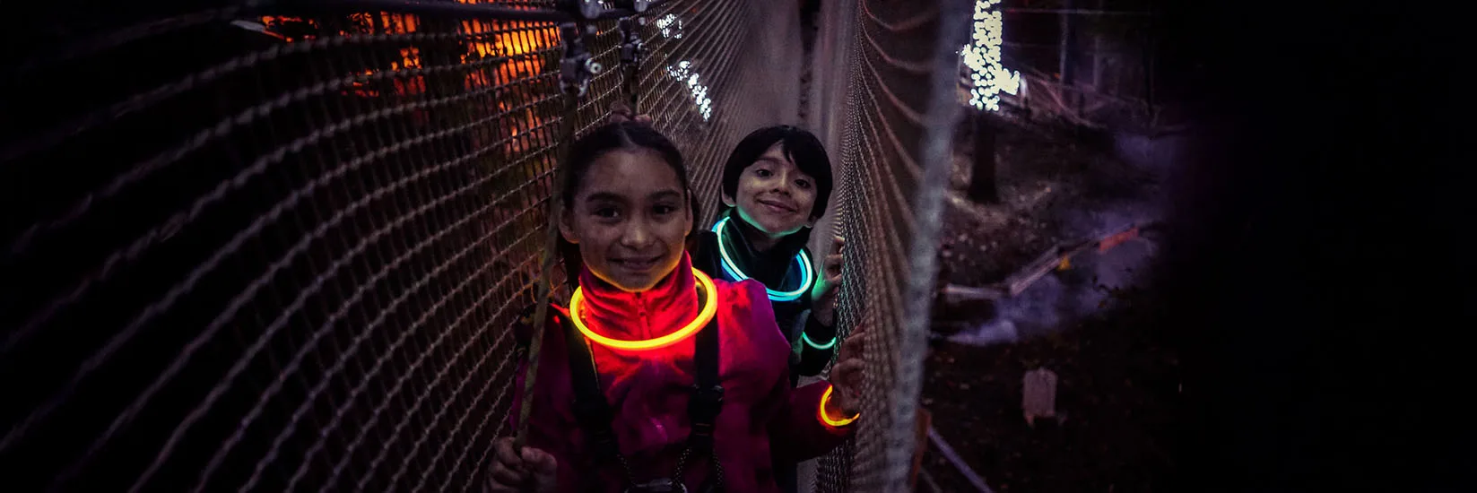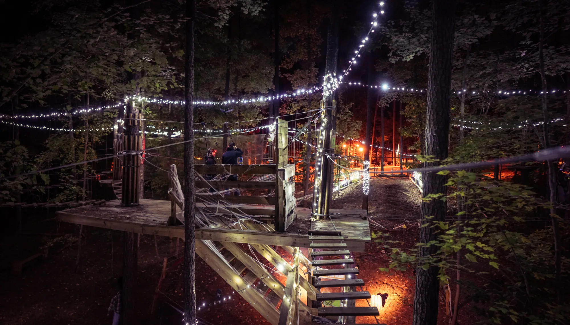 Soft lighting leads your way through the trees, creating a safe but thrilling nighttime challenge.